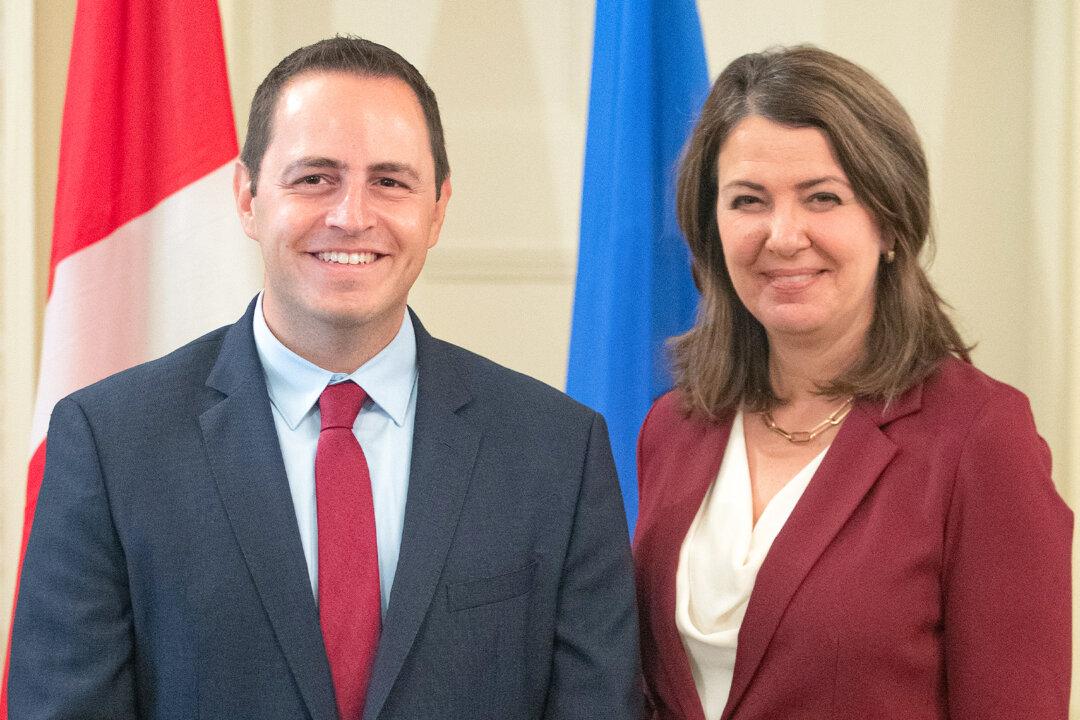Alberta Premier Danielle Smith and Minister of Education Demetrios Nicolaides stand together during the swearing in of her cabinet in Edmonton, June 9, 2023. (Jason Franson/The Canadian Press)
