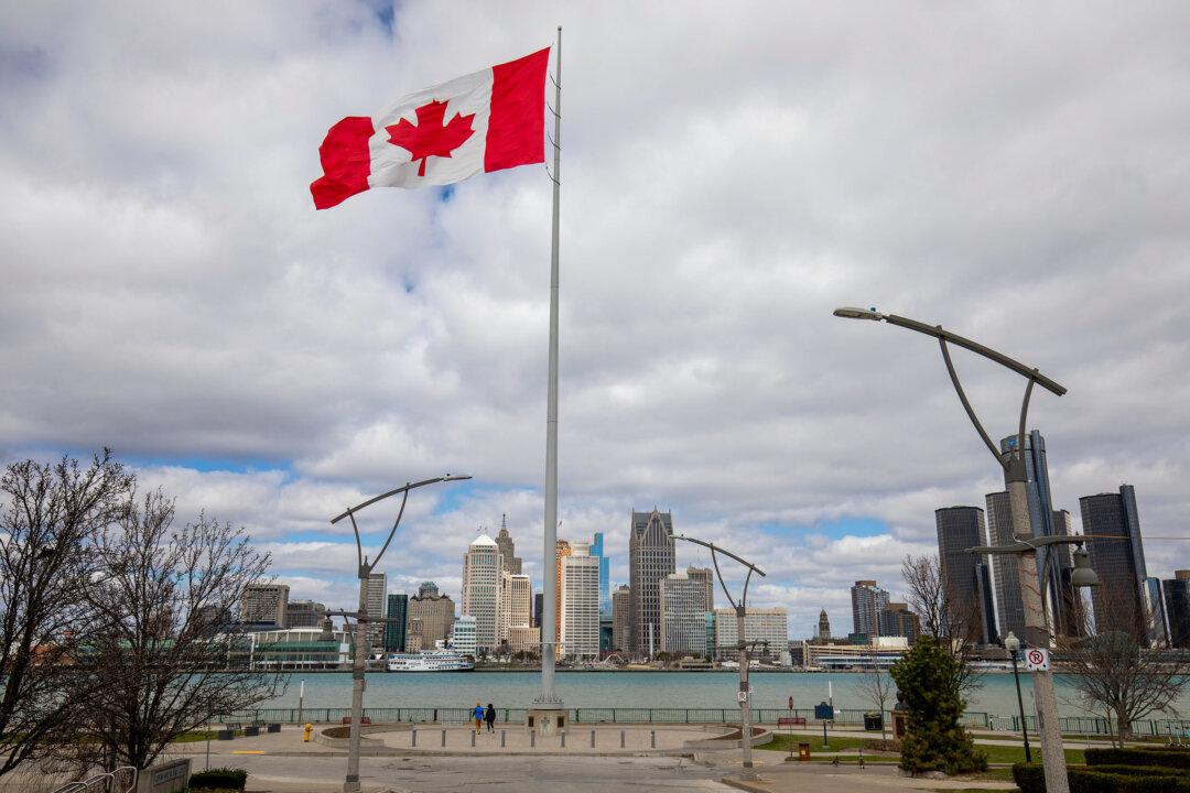 A Canadian flag flies in downtown Windsor as the skyline of Detroit, Michigan is shown in the background on April 1, 2025 in Windsor, Ont. (Photo by Bill Pugliano/Getty Images)