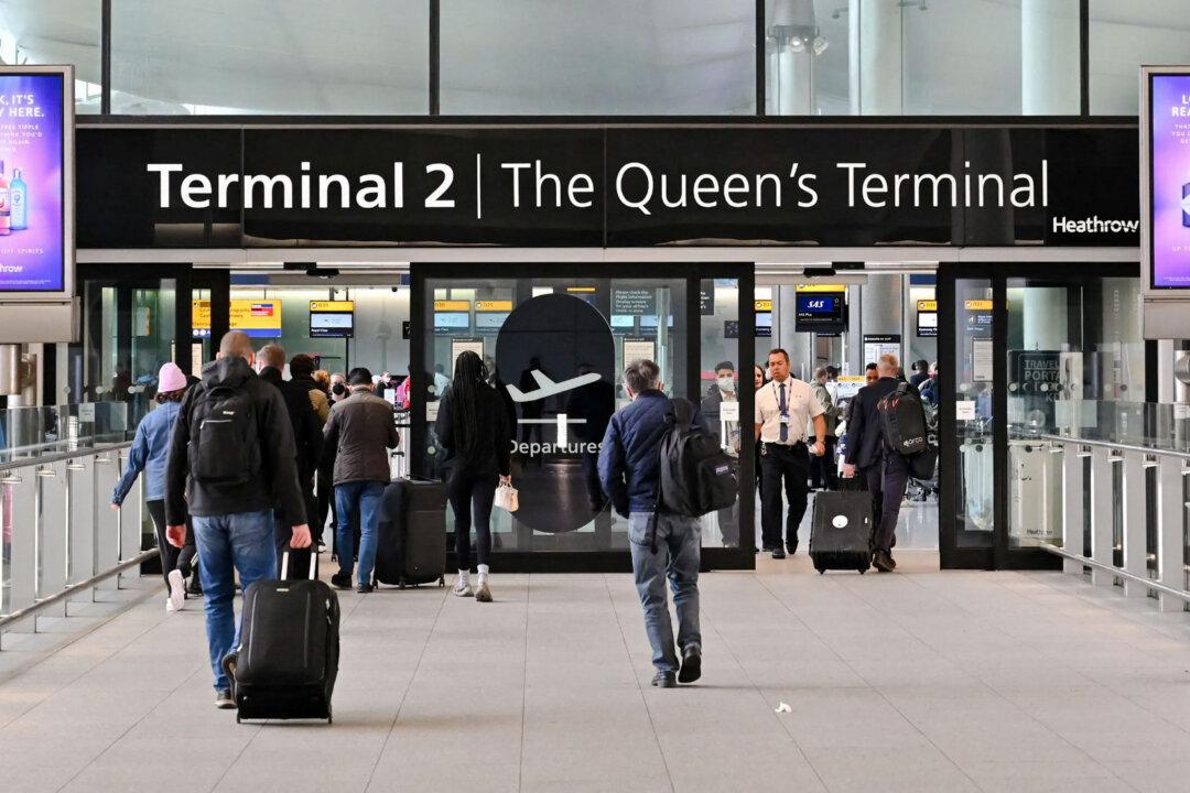 Travelers arrive at Terminal 2 of London Heathrow Airport in London, UK, on April 6, 2022. (Justin Tallis/AFP via Getty Images)